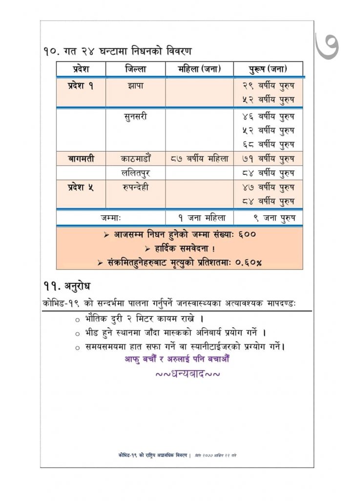 पछिल्लो २४ घण्टामा थप १० जनाको कोरोनाले मृत्यु भएसँगै हालसम्म ज्यान गुमाउनेको संख्या ६०० पुगेको छ ।
