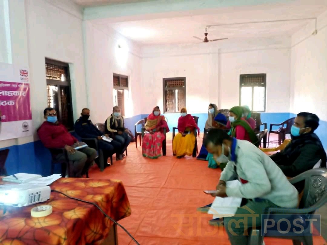 यु.के.एडको आर्थिक सहयोगमा भीएसओ तथा इन्टरनेशनल अलर्टको साझेदारीमा समग्र जन उत्थान केन्द्र लहान-६सिरहा द्वारा संचालित सहज परियोजनाको समिक्षा बैठ बोदे बर्साईन नगरपालिका वडा नम्बर- ५ वडा अध्यक्ष मो.मजिवुर रहमानको अध्यक्षतामा सम्पन्न भएकोछ । उक्त कार्यक्रममा समग्र जन उत्थान केन्द्रका प्रयोजना ब्यवस्थापक कृष्ण कुमार साह,कार्यक्रम अधिकृत रामभरोसी महतो,न्यायिक समिति सदस्य बेचनी देवी दास , ईलका प्रहरी कार्यालय प्रमुख प्रहरी न्याव निरीक्षक अयोध्या शरन यादव ,प्रहरी न्याव निरीक्षक रामबाबु यादव,स्थानीय सहजकर्ता लोकेन्द्र प्रसाद यादव,ओम प्रकाश ठाकुर लगायतको उपस्थित थियो ।