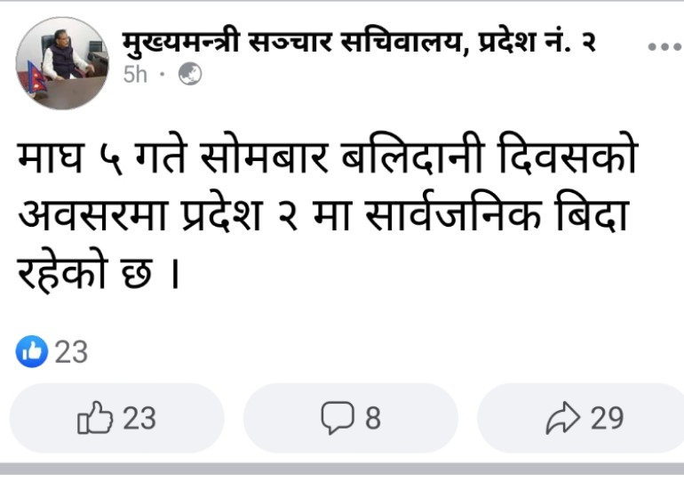 मुख्यमन्त्रीको प्रदेश सँचार सचिवालयको अनुसार सोमबार अर्थात यस वर्षको माघ ५ गते (भोली) मनाइने बलिदानी दिवसको अवसरमा सार्वजनिक विदा दिने घोषणा गरिएको हो ।