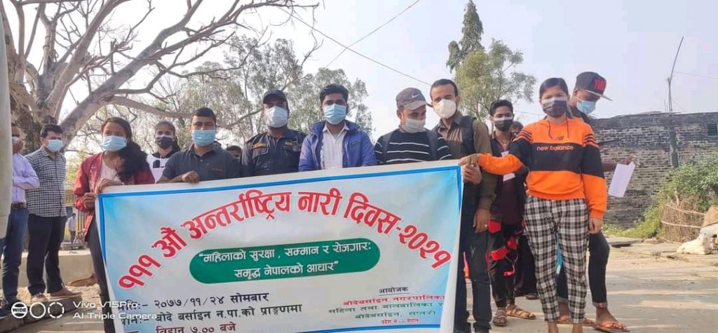उमेश कुमार साह/सप्तरी,फागुन २४ गते।सप्तरीको बोदे बर्साईन नगरपालिकामा पनि १११ औं अन्तर्राष्ट्रिय नारी दिवस मनाएकाछन् ।” महिलाको सरक्षा, सम्मान र रोजगार : समृद्ध नेपालको आधार” मूल नाराका साथ बोदे बर्साईन नगरपालिका महिला तथा बालबालिका शाखाले तथ संयुक्त रूपमा समग्र जन उत्थान केन्द्र लहान सिरहाले संयुक्त रूपमा मनाएकाछन् । विभिन्न महिला हिंसा अन्त्य सम्बन्धि नारा लगाई बोदे बर्साईन नगरपालिका प्राङ्गनबाट निस्केको प्रभात फेरि बजार क्षेत्र परिक्रमा गरि पुन:ह नगरपालिका प्राङ्गणमा आई सभमा प्रणत भएका थिए ।