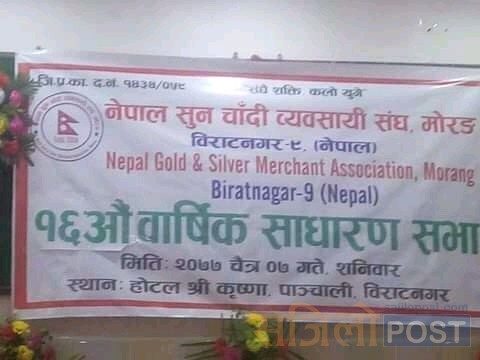 विष्णुदेव सरदार,चैत्र ८ गते।हिजो चैत्र ७ गते मोरङ जिल्लाको श्री कृष्ण पञ्चावली होटल विराटनगरमा आयोजित नेपाल सुन चाँदी व्यवसायी संघ विराटनगर ९ – मोरङले १६ औं वार्षिक साधारणसभा सम्पन्न गरेको छ।