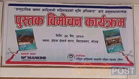 विसुन देव सरदार /लहान / चैत्र ३० गते।राष्ट्रिय आदिवासी जनजाति महिला महासंघ मोरङले आयोजना गरेको ” सामुदायिक वनमा आदिवासी महिलाहरुको भुमि अधिकार ” बारे अनुसन्धानात्मक पुस्तक विमोचन कार्यक्रम सम्पन्न गरेको जानकारी प्राप्त भएको छ।कार्यक्रम हिजो चैत्र २९ गते आइतबार होटल इष्टर्न स्टार , विराटनगर , मोरङ्गमा गरेको छ।
