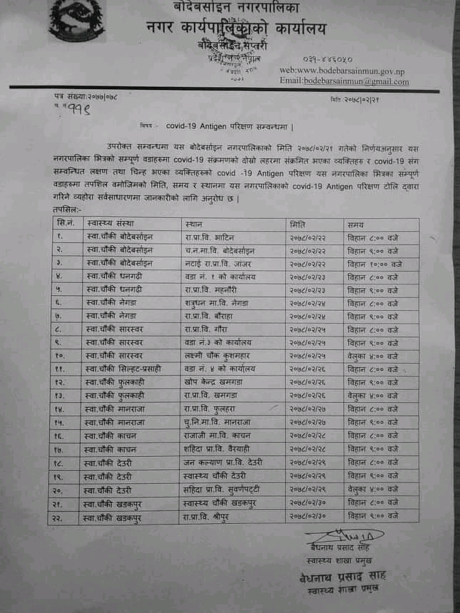 बोदे बर्साईन ०५ स्थित स्वास्थ चौकीमा रहेको आईसुलेसनमा संक्रमितको उपचार भईरहेको भन्दै उहाँले कोरोना विरुद्ध संघीय, प्रदेश सरकार र अन्य स्थानीय तहबीच समन्वयमा विभिन्न काम भईरहेको बताउनुभएको छ । साथै नगर भित्र सम्पुर्ण वडा भित्र बोदेबर्साइन न.पा. भित्र सम्पूर्ण वडाहरूमा २०७८ जेठ् २१ गते देखी कोभिड -१९ एन्टिजोन परिक्षण भईरहेको हुँदा सम्पूर्ण नागरवासिमा हार्दिक अनुरोध गर्नु भएको छ, की कोभिड १९ महामारी नियंतान्न गर्न साधारण किसिमको रुँधा खोकी लागेको ब्यक्ति , सिकिश्त किशिमको बिरारामी र संकालागेका सम्पूर्ण ब्यक्तिहरुले नि:शुल्क कोभिड १९ को जाच गराई आफुलाई बचाऊ र अरुलाई पनि बचाऊ आग्रह गर्नु भएको छ।साथै आवश्यक परेमा निरन्तर रूपमा एम्बुलेन्स सेवा नि:शुल्क उपलब्ध गराउनु भएका छन।
