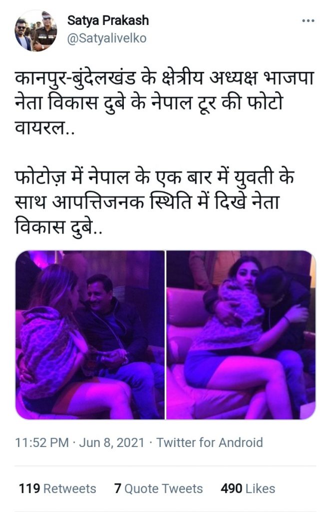भारतीय जता पार्टी (भाजपा) का क्षेत्रीय अध्यक्ष विकास दुबेको तस्बिर अहिले भारतभर भाइरल भइरहेको छ ।तस्विरमा उनको नेपाल भ्रमणलाई देखाइएको छ ।