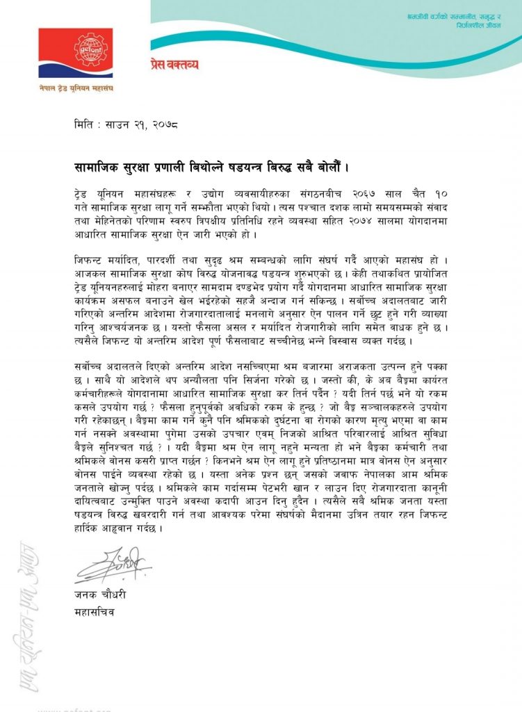 सर्वोच्चको अन्तरिम आदेश आएको दुई दिनपछि जिफन्टका महासचिव जनक चौधरीले जारी गरेको विज्ञप्तिमा लेखिएको छ, ‘आजकल सामाजिक सुरक्षा कोषविरुद्ध योजनावद्ध षडयन्त्र शुरु भएको छ । केही तथाकथित प्रायोजित ट्रेड युनियनहरुलाई मोहरा बनाएर सामदाम दण्डभेद प्रयोग गर्दै योगदानमा आधारित सामाजिक सुरक्षा कार्यक्रम असफल बनाउने खेल भइरहेको सहजै अन्दाज गर्न सकिन्छ ।’