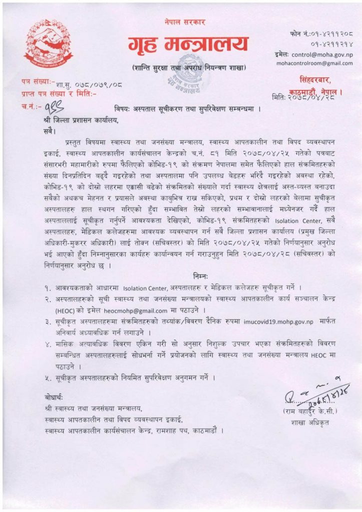 पहिलो र दोस्रो लहरको बेलामा सूचीकृत अस्पतालहरु हाल स्थगन गरिएको हुँदा सम्भावित तेस्रो लहरको सम्भावनालाई मध्यनजर गर्दै हाल अस्पताललाई सूचीकृत गर्नुपर्ने आवश्यक देखिएको भन्दै मन्त्रालयले आवश्यकताको आधारमा आइसोलेसन सेन्टर, अस्पतालहरु र मेडिकल कलेजहरु सूचीकृत गर्न निर्देशन दिएको हो ।
