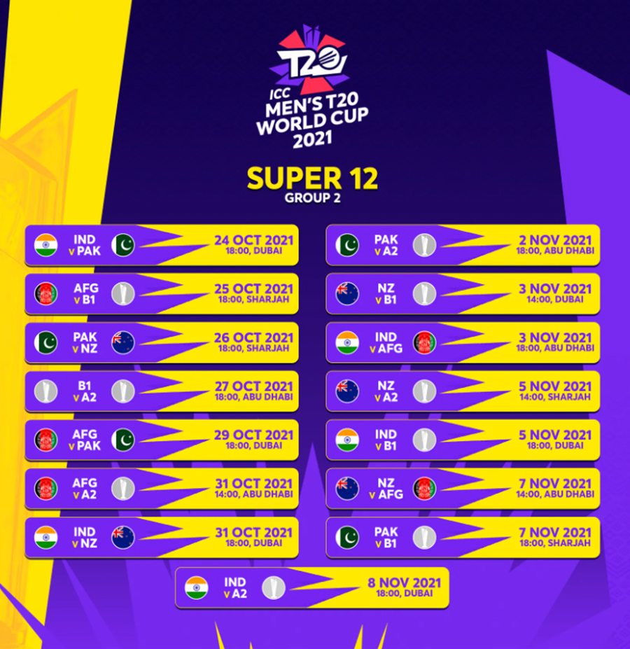 सुपर १२ को समूह २ मा रहेको भारतले पहिलो खेलमा पाकिस्तानसँग अक्टोबर २४ मा प्रतिस्पर्धा गर्नेछ ।