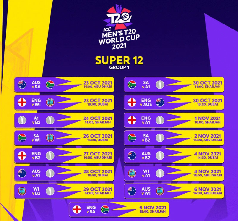 सुपर १२ को ग्रुप वानमा अष्ट्रेलिया, साउथ अफ्रिका, इंग्ल्याण्ड र वेष्टइन्डिज छन् । यस्तै ग्रुप २ मा भारत, पाकिस्तान, न्युजिल्याण्ड र अफगानिस्तान छन् ।