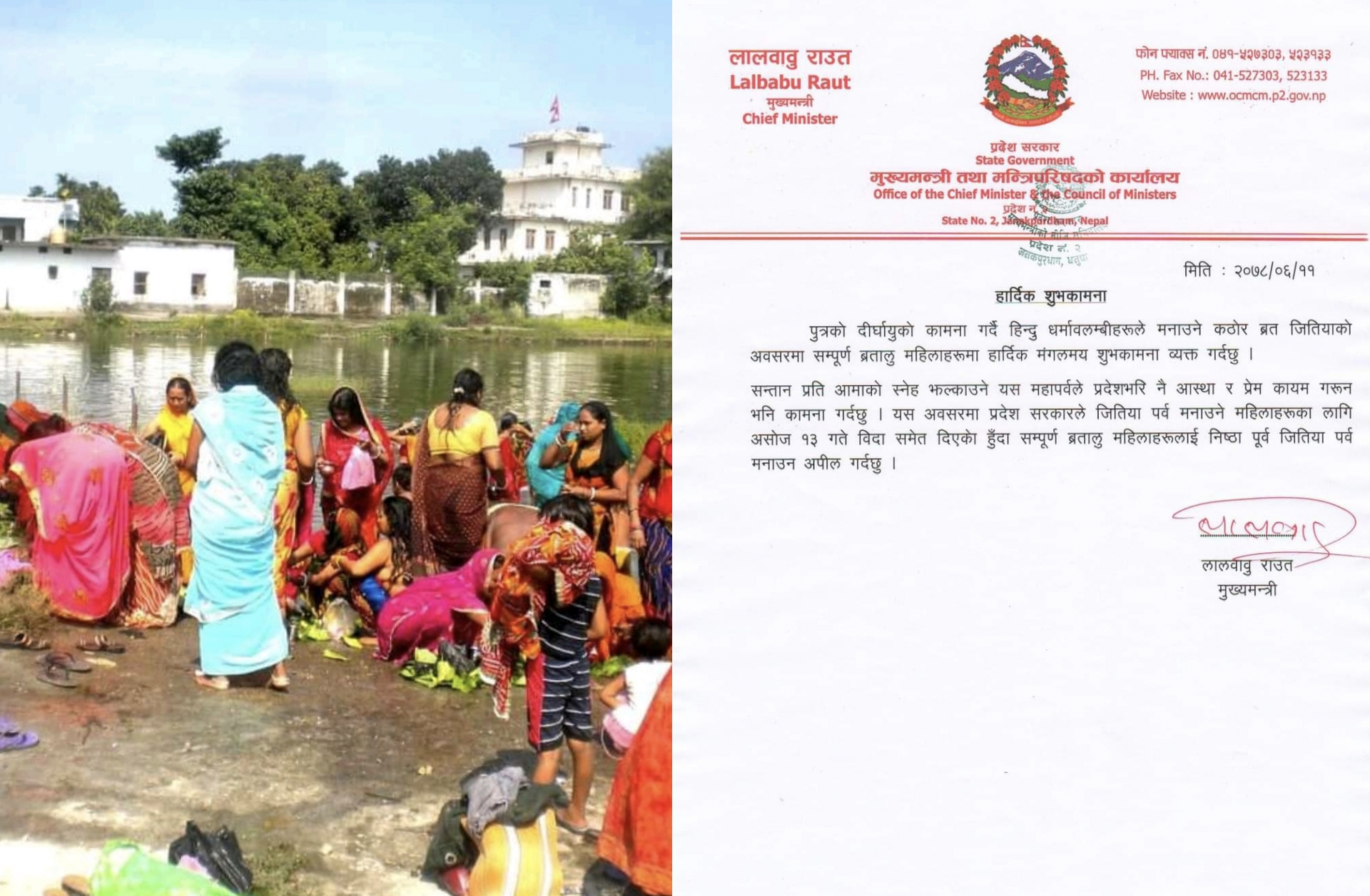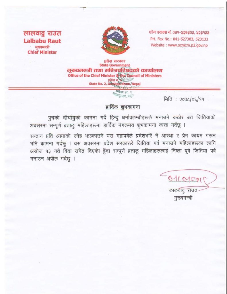 मुख्यमन्त्री लालबाबु राउतले आज शुभकामना सन्देश जारी गर्दै सार्वजनिक विदाबारे जानकारी दिएका हुन् । उनले भनेका छन्, ‘प्रदेश सरकारले जितिया पर्व मनाउने महिलाहरुका लागि असोज १३ गते विदा समेत दिएको हुँदा सम्पूर्ण ब्रतालु महिलाहरुलाई निष्ठा पूर्वक जितिया पर्व मनाउन अपिल गर्दछु ।’