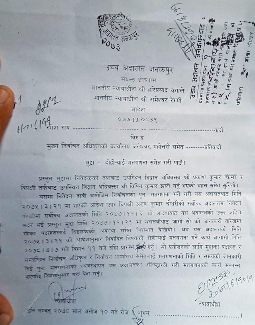 न्यायाधीशहरु हरिप्रसाद बगाले र रामेश्वर रेग्मीको इजलासले फेरी मतगणनाको आदेश दिएको हो । आदेश अनुसार ७ कात्तिकमा बिहान ११ बजेदेखि मतगणना हुनेछ ।