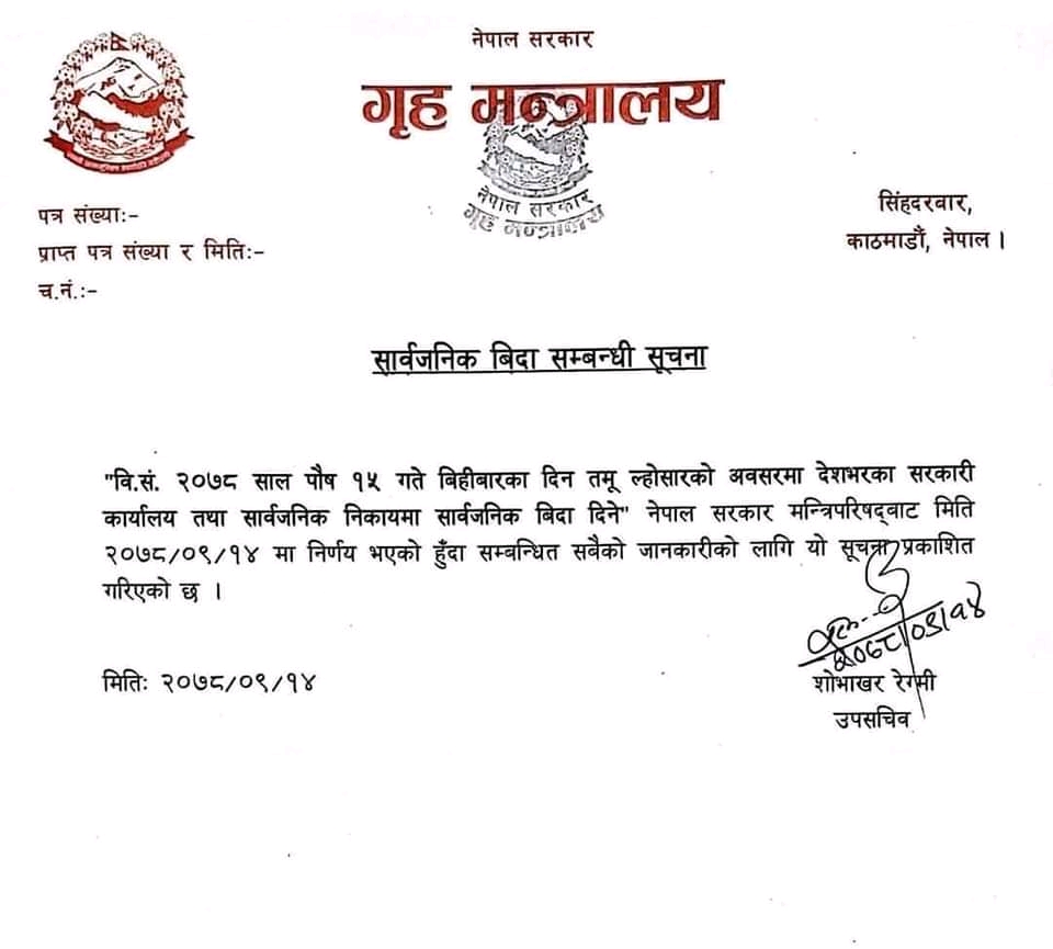 पुस १४ गते । सरकारले भोलि पुस १५ गतेको तमु ल्होसारका लागि सार्वजनिक विदा दिने निर्णय गरेको छ । केहीबेर अघिको मन्त्रिपरिषद बैठकले विदा दिने निर्णय गरेको हो ।तमु ल्होसारको अवसरमा बिहीबार सार्वजनिक बिदा दिने निर्णय भएको हो।