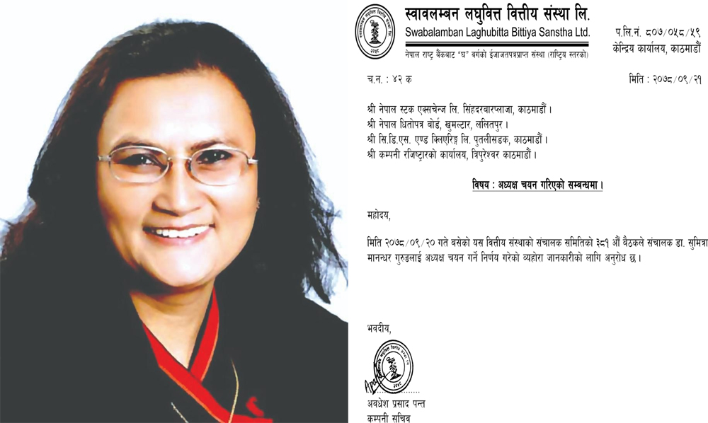काठमाडौं/पुस २१ गते। स्वावलम्बन लघुवित्त वित्तीय संस्था लिमिटेडले अध्यक्षमा डा.सुमित्रा मानन्धर गुरुङलाई चयन गरेको छ ।