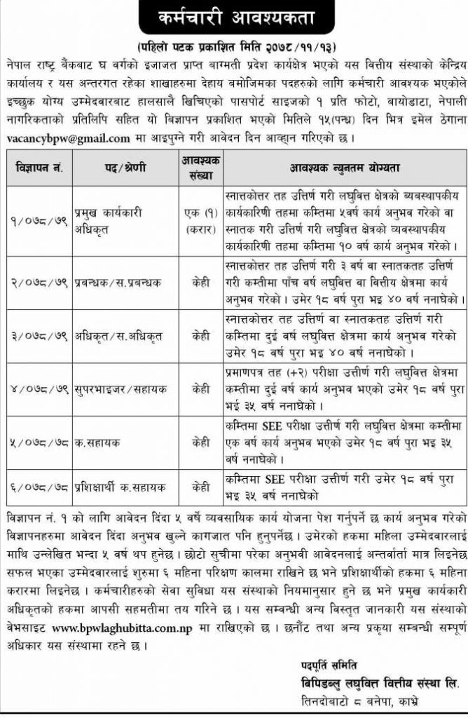 बिपिडब्लु लघुवित्तमा रोजगारीको अवसर,SEE उतिर्णले पनि आवेदन दिन पाउने (हेर्नुहोस भ्याकेन्सी नोटिस सहित)