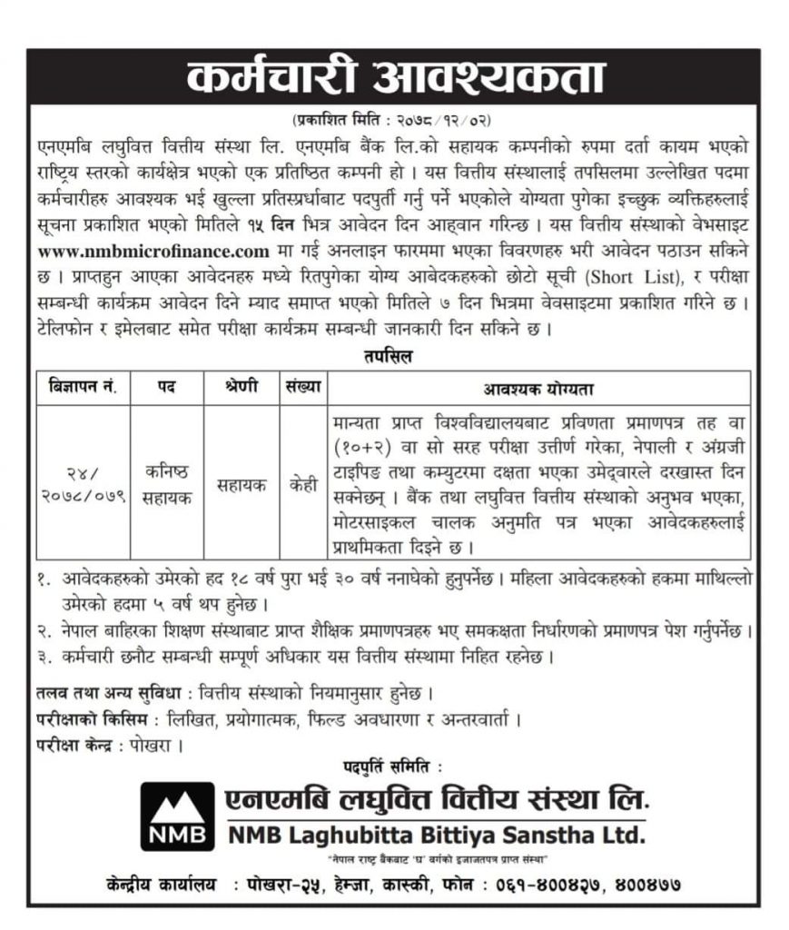 चैत २ गते । एनएमबि लघुवित्त वित्तीय संस्था लिमिटेडले कर्मचारी माग गरेको छ । संस्थाले कनिष्ठ सहायकमा केही संख्यामा कर्मचारी मागेको हो ।