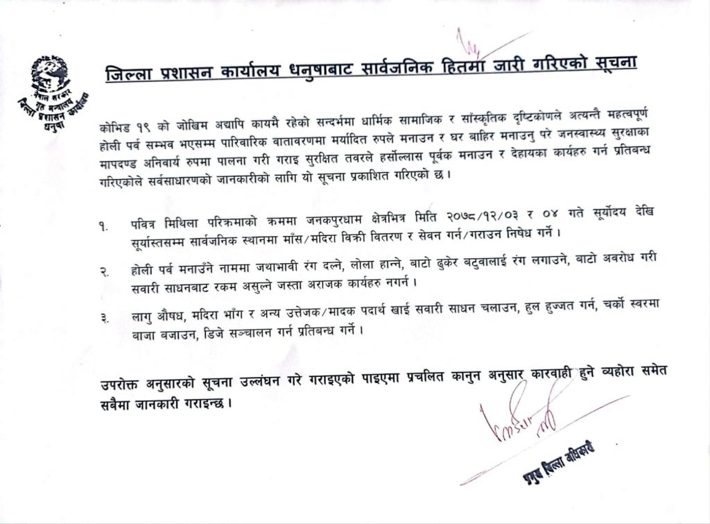 त्यस्तै, होली पर्व मनाउने नाममा जथाभावी रङ दल्ने, लोला हान्ने, बाटो ढुकेर बटुवालाई रङ लगाउने, बाटो अवरोध गरी सवारीसाधनबाट रकम असुल्नेजस्ता कार्य नगर्न पनि धनुषा प्रशासनले सचेत गराएको छ ।