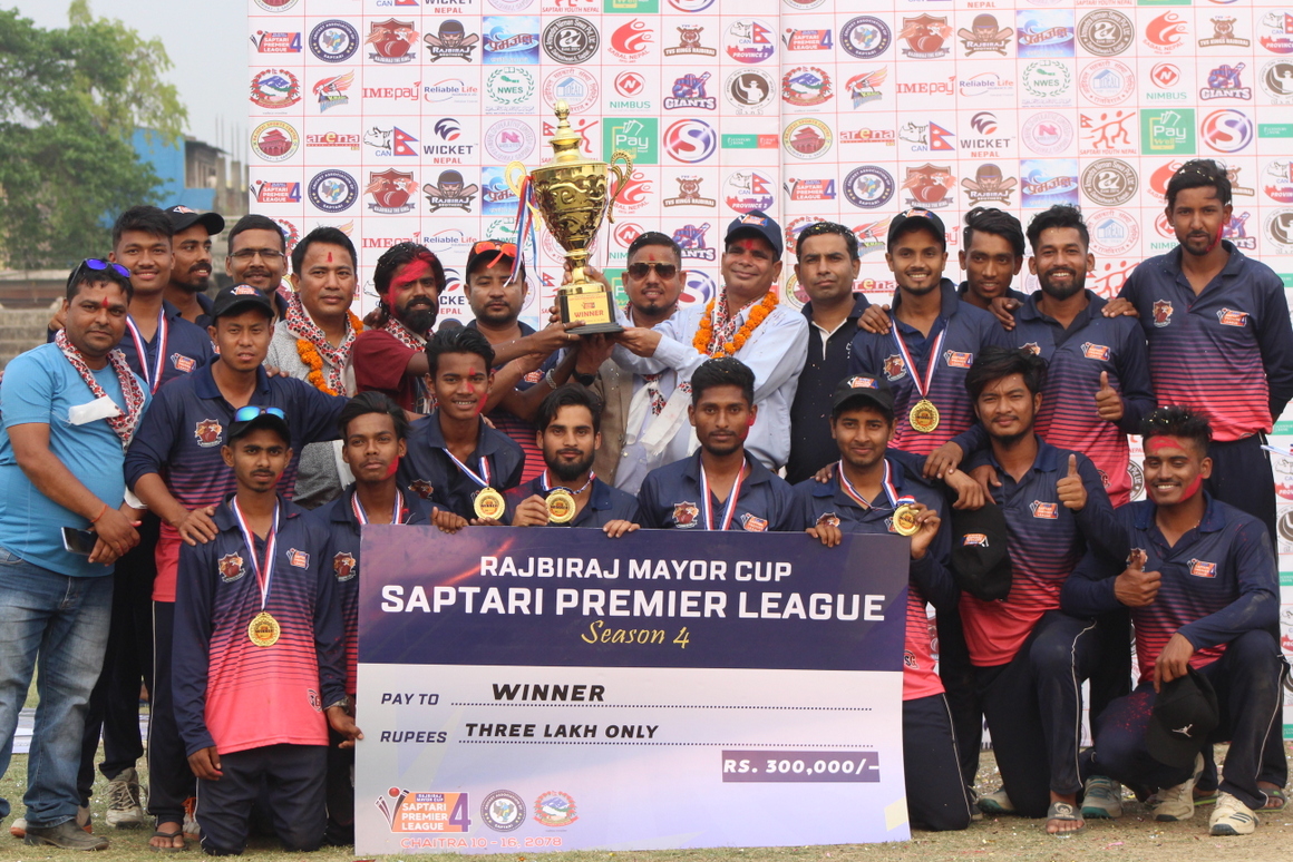 सप्तरी/चैत १६ गते। राजविराज दी किङ्सले चौंथो संस्करणको राजविराज सप्तरी प्रिमियर लिगको उपाधि जितेको छ । राजविराज स्थित राज रंगशालामा सम्पन्न फाइनलमा तिलाठी कोइलाडी जायन्ट्सलाई २९ रनले पराजित गर्दै राजविराजले उपाधि जितेको हो ।