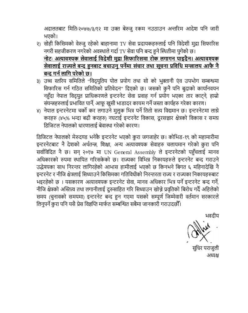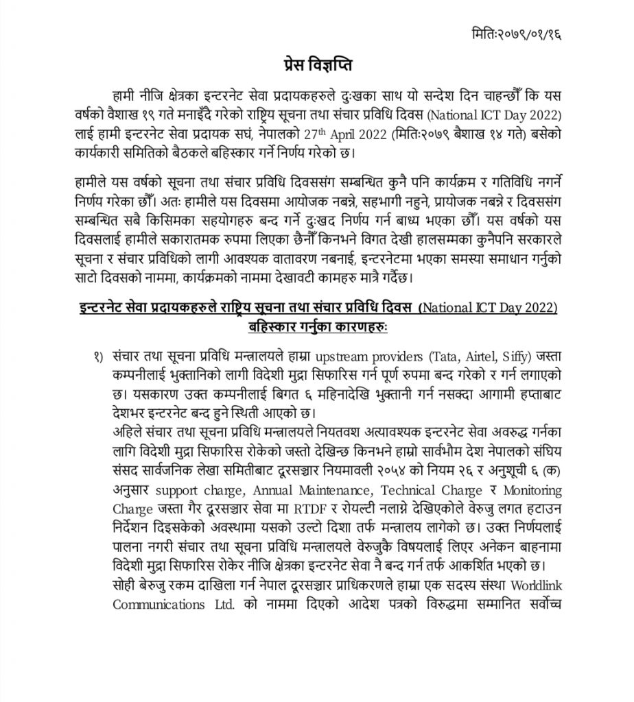‘सञ्चार तथा सूचना प्रविधि मन्त्रालयले टाटा, एयरटेल र सिफी जस्ता कम्पनीलाई विदेशी रकममा भुक्तानी सिफारिस पूर्ण रूपमा बन्द गरेको छ,’ विज्ञप्तिमा लेखिएको छ, ‘जसकारण विगत ६ महिनादेखि भुक्तानी रोकिएको छ ।’ लामो समयदेखि भुक्तानी रोकिएकाले आगामी सातादेखि इन्टरनेट सेवा रोक्नुपर्ने बाध्यात्मक स्थिति आउन सक्ने बताइएको छ ।