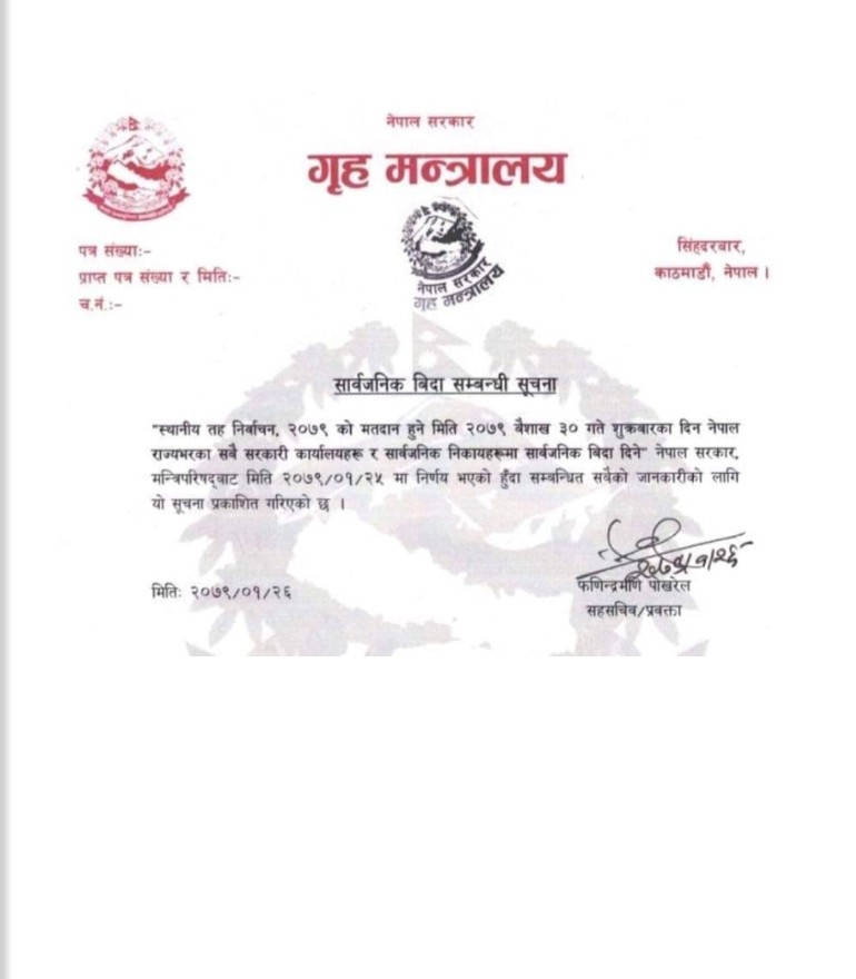 गृह मन्त्रालयले मन्त्रिपरिषदको निर्णयअनुसार बैशाख ३० गते शुक्रबार सबै सरकारी कार्यालय र सार्वजनिक निकायहरुमा बिदा दिने जनाएको हाे ।