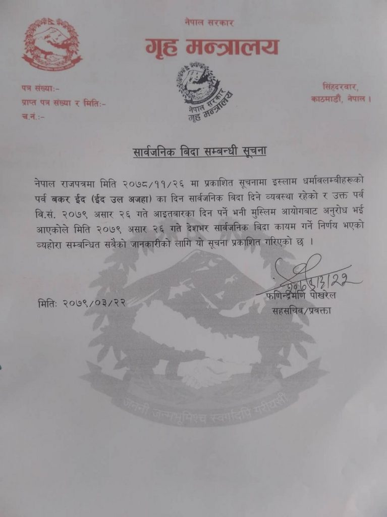 ‘२०७८ फागुन २६ गते नेपाल राजपत्रमा प्रकाशित सूचनामा इस्लाम धर्मावलम्बीहरुको पर्व बकर इद (इद उल अजहा) का दिन सार्वजनिक बिदा दिने व्यवस्था रहेको छ’, गृहले भनेको छ, ‘उक्त पर्व असार २६ गते आइतवार पर्ने भनी मुस्लिम आयोगबाट अनुरोध भएकाले सार्वजनिक बिदा कायम गर्ने निर्णय भएको छ।’