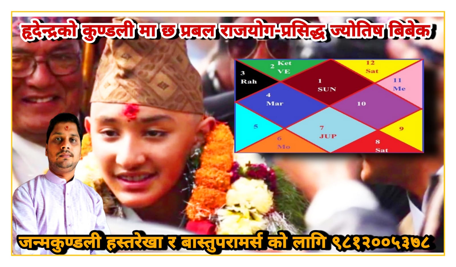 उनले अघि थपेका छन्,‘हृदयेन्द्रको जन्म लग्न कुण्डलीको दशमभाव केन्द्र भावमा कर्कटको बृहस्पति उच्च भएर रहेको अवस्था हँुदा सबै अरिष्टहरू नाश भएका छन् । दशमभावमा रहेका ४ ग्रह मध्ये ३ ग्रह सूर्य, बुध, बृहस्पति कारक ग्रह हुन् । दशमस्थानको सूर्यले राज्यकृपा गराउँछ भने मंगलसँग बुधको युति पनि यसै घरमा भएकाले जातकलाई सुरवीर गराउँछ।’