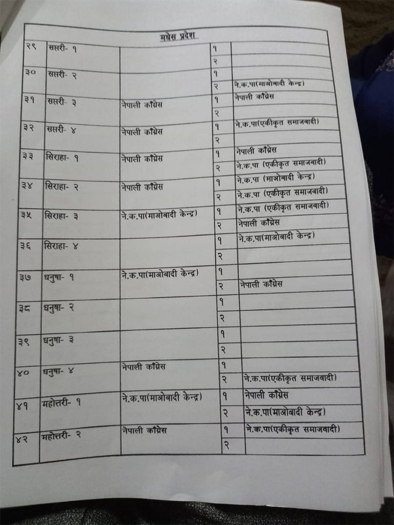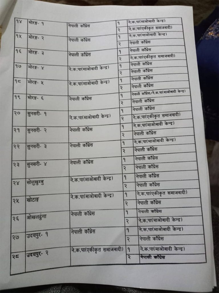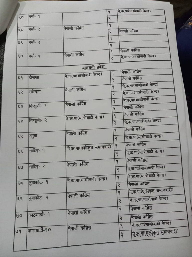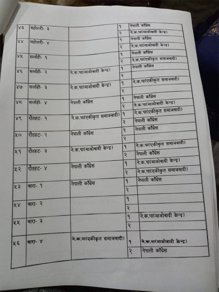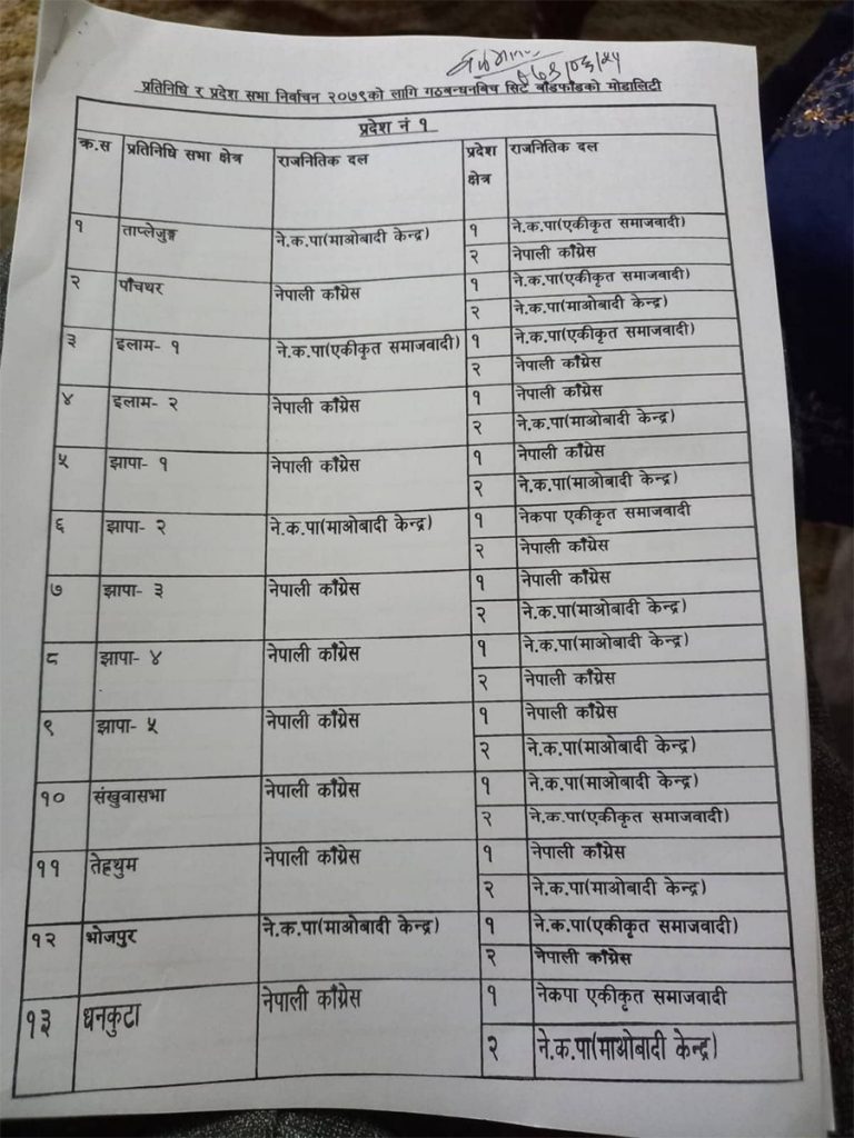 र गठबन्धका एक नेताका अनुसार सत्ता गठबन्धनका दलहरु ८ सिट दिन सहमत भएका छन् । ४ सिटमा छलफल चलिरहेको छ । हालसम्म कांग्रेसले प्रतिनिधिसभाको ८४ सिट, माओवादीले ४७, एकीकृत समाजवादीले २० र राष्ट्रिय जनमोर्चाले २ सिट पाउने भएको छ ।