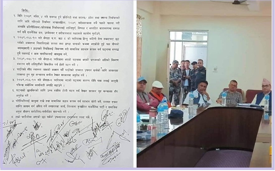 बर्दिवास/कार्तिक ११ गते । महोत्तरीको भङ्गहा नगरपालिका ८ पररियामा भएको झ डपमा संलग्न समुदाय र स्थानीय प्रशासनबीच आठ बुँदे सहमति भएको छ।