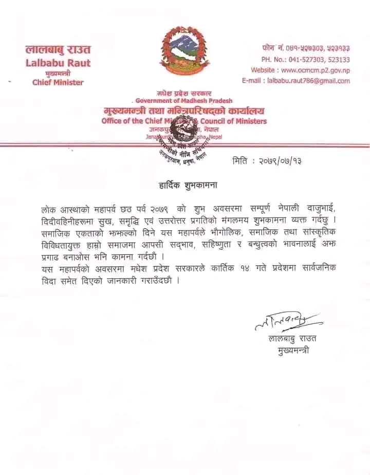 मुख्यमन्त्री लालबाबु राउतद्वारा जारी विज्ञप्तिमा सामाजिक एकताको पर्वको रुपमा रहेको छठ महापर्वले भौगोलिक, सामाजिक तथा सांस्कृतिक विविधतायुक्त हाम्रो समाजमा आपसी सद्भाव, सहिष्णुता र बन्धुत्वको भावनालाई अझ प्रगाढ बनाउने विश्वास व्यक्त गरिएको छ ।