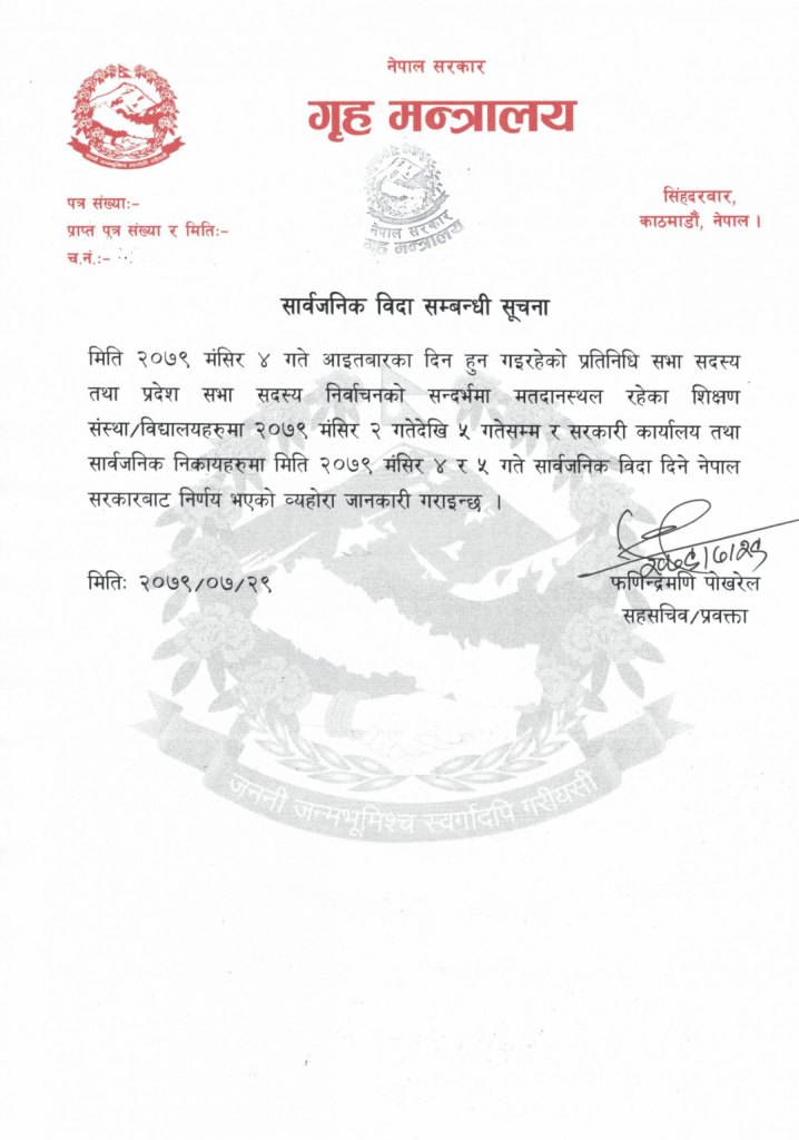आगामी प्रदेश र प्रतिनिधिसभा निर्वाचनलाई लक्षित गरी सरकारले बिदा दिने निर्णय गरेको हो । मंगलबार बिहान गृह मन्त्रालयले विज्ञप्ति जारी गर्दै २, ४ र ५ मंसिरमा बिदा दिने बताएको हो ।