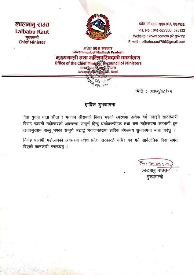मधेशका मुख्यमन्त्री लालबाबु राउतले एक शुभकामना संदेश जारी गर्दै विवाहपञ्चमीको अवसरमा सार्वजनिक विदा रहेको जानकारी गराएका छन् ।