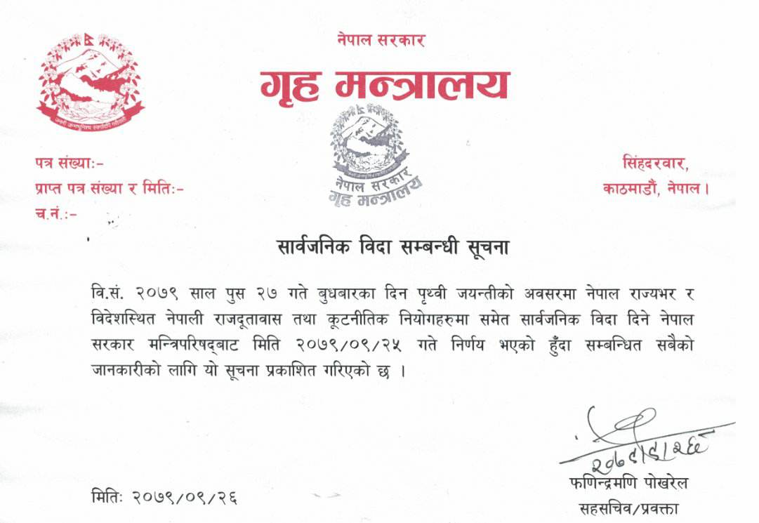 गृह मन्त्रालयको सूचना– भोलि देशभर सार्वजनिक बिदा