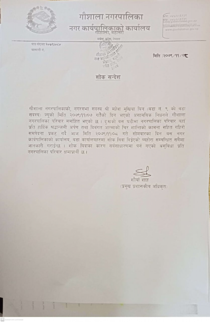 नगरसभा सदस्य महेश मुखिया बिनको आइतबार मृ त्यु भएपछि नगरपालिकाले शोक व्यक्त गर्दै आज शोक बिदा दिएको प्रमुख प्रशासकीय अधिकृत शौर्या शाहले जानकारी दिए ।