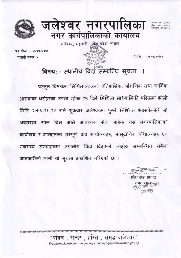 मिथिला मध्यमा परिक्रमा अन्तरगत विश्राम स्थल रहेकाले नगरपालिकमा भोलि सार्वजनिक बिदा दिइएको मेयरद्वारा हस्ताक्षरित सूचनामा उल्लेख छ ।