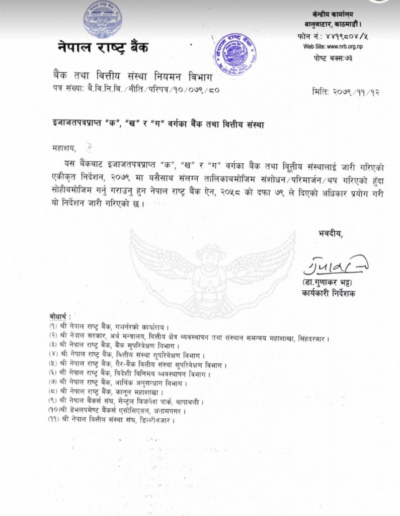 नेपाल राष्ट्र बैंकले क, ख र ग वर्गका बैंक तथा वित्तीय संस्थालाई जारी गरेको एकीकृत निर्देशन २०७९ मा संशोधन तथा परिमार्जन गर्दै शुक्रबार यस्तो प्रावधान ल्याएको हो । यो प्रावधन परिमार्जन भएसँगै अब आकस्मिक सार्वजनिक बिदामा बैंक तथा वित्तिय संस्था खुला रहनेछन् ।
