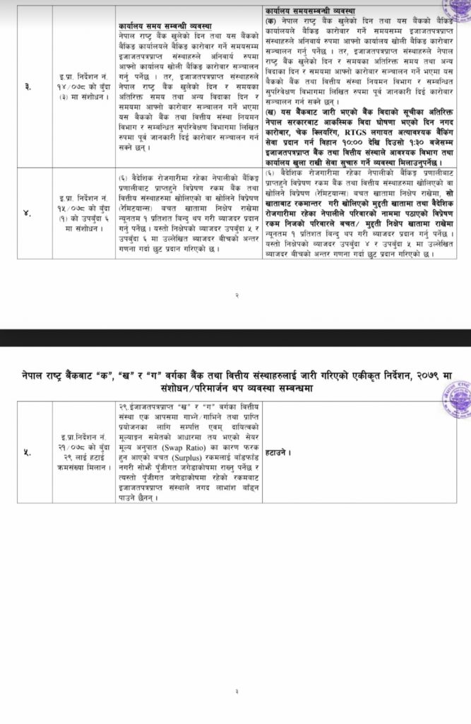 आकस्मिक बिदाको दिन १० बजेदेखि १:३० बजेसम्म कार्यालय खुला राखी बैंक तथा वित्तिय आवश्यक विभाग र कार्यालय खुला राखेर सेवा सूचारु गर्नुपर्ने राष्ट्र बैंकको निर्देशन छ ।