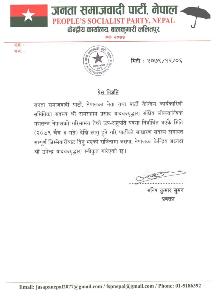 जसपा नेपालका अध्यक्ष उपेन्द्र यादवले उपराष्ट्रपतिमा निर्वाचित भएको मिति चैत ३ गते देखी लागु हुने गरी राजीनामा स्वीकृत गरेको प्रवक्ता मनिष सुमनले जानकारी दिए ।