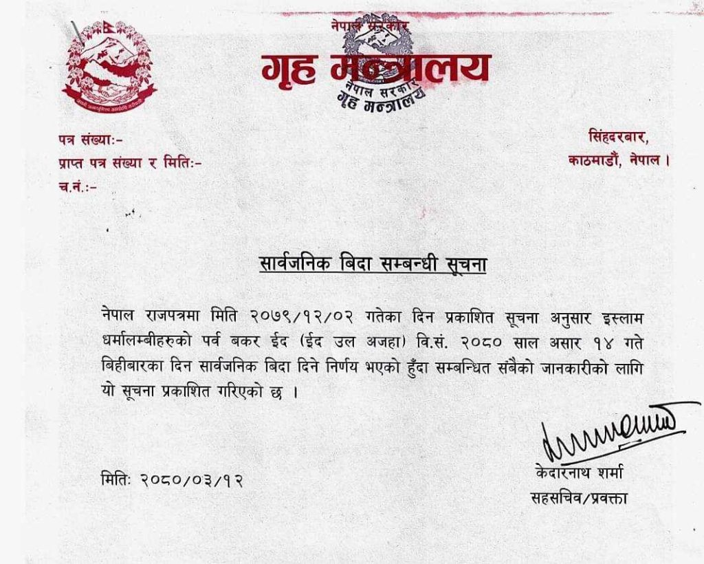 असार १२ गते। नेपाल सरकारले यही असार १४ गते बिहीबार इस्लाम धर्मावलम्बीहरूको पर्व बकर ईद (ईद उल अजहा) को अवसरमा सार्वजनिक बिदा दिने निर्णय गरेको छ ।