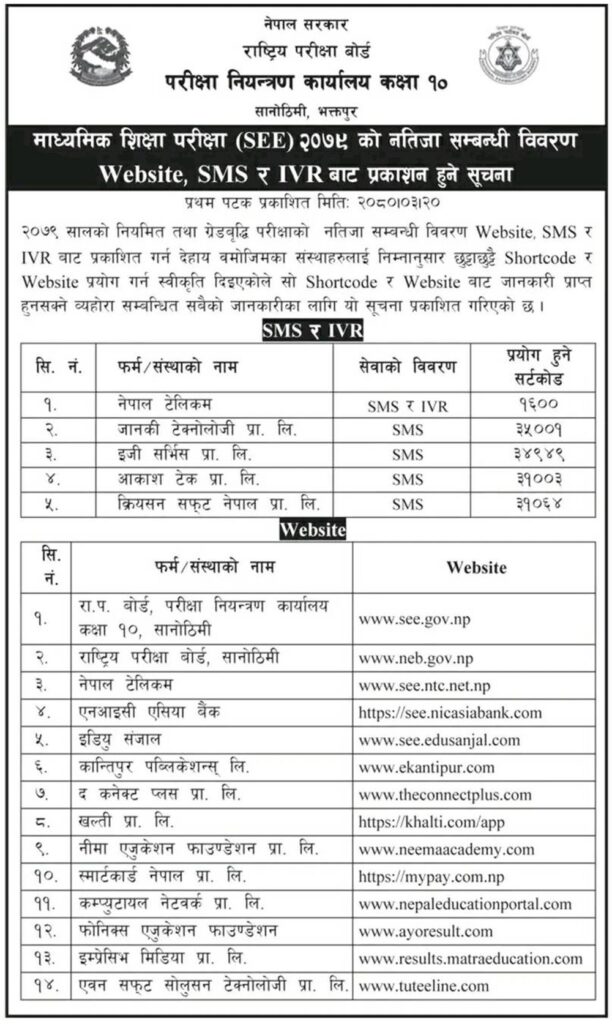 एसएमएसका लागि १६००, ३१००३, ३४९४९, ३५००१ र ३१०६४ मा डायल गर्न सक्ने व्यवस्था गरेको छ । नतिजाका हेर्नका लागि राष्ट्रिय परीक्षा बोर्डअन्तर्गतको कक्षा १० को परीक्षा नियन्त्रण कार्यालय सानोठिमी भक्तपुरको बेवसाइट www.see.gov.np मा हेर्न सकिने बोर्डले जनाएको छ ।