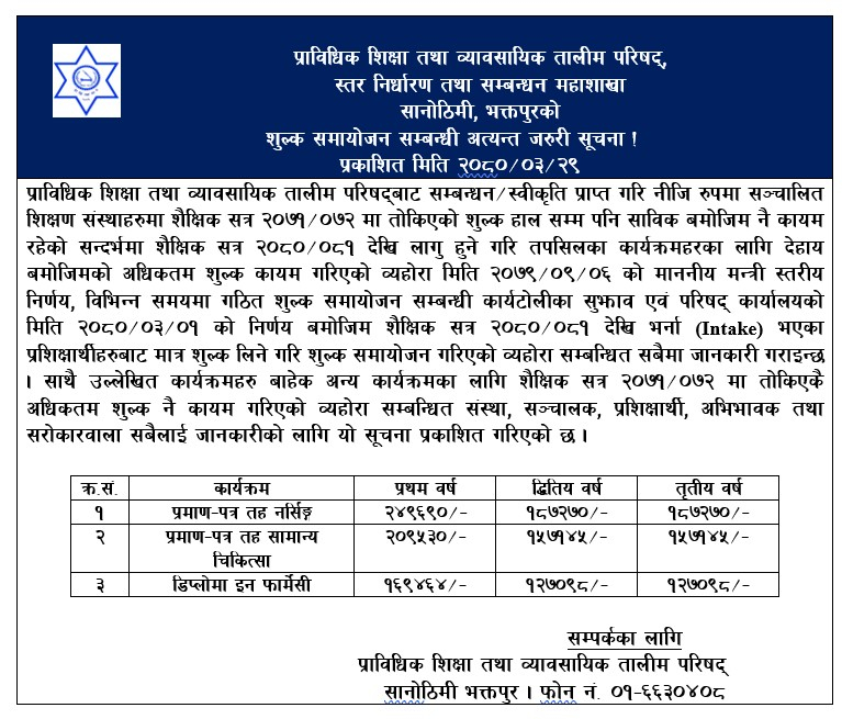 काठमाडौँ/असार ३० गते। प्राविधिक शिक्षा तथा व्यावसायिक तालिम परिषद् (सीटीईभीटी)ले मेडिकलतर्फ नर्सिङ, एचए (सामान्य चिकित्सा) र फार्मेसीको अध्ययन शुल्क वृद्धि गरेको छ ।