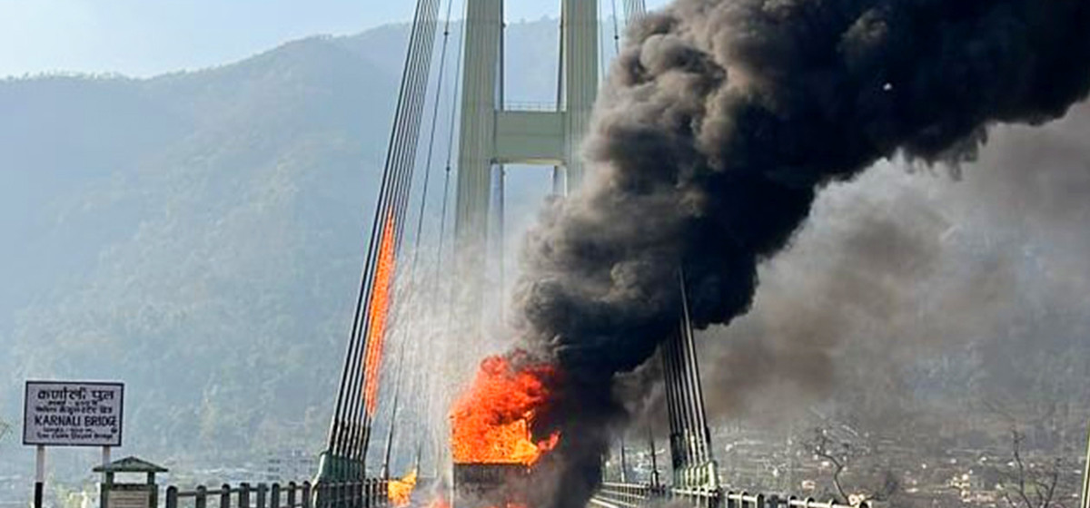 फागुन २९ गरे। सोमबार भएको आगलागीबाट आंशिकरूपमा क्षति भएपछि कर्णाली पुलमा सवारीसाधन आवागमन बन्द गरिएको छ । प्राविधकको विशेषज्ञ टोलीले पुलको परीक्षण गरेरमात्र सवारी आवागमन सञ्चालन गर्न सकिने सडक डिभिजन कार्यालय नेपालगञ्जले जनाएको छ । आगलागीबाट पुलको १४ ‘सपोट’ डोरीमा आंशिक क्षति पुगेको छ ।