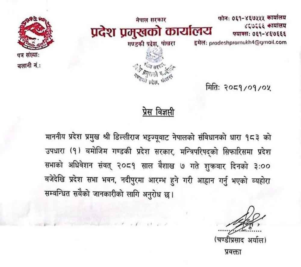 बैशाख ५ गते। गण्डकी प्रदेशसभाको अधिवेशन वैशाख ७ गतेका लागि आह्वान गरिएको छ । प्रदेश प्रमुख डिल्लीराज भट्टले ७ गते ३ बजेदेखि प्रदेश अधिवेशन आह्वान गरेका हुन् । यस अधिवेशनमा मुख्यमन्त्री खगराज अधिकारीले विश्वासको मत लिने तयारी समेत गरेका छन् ।
