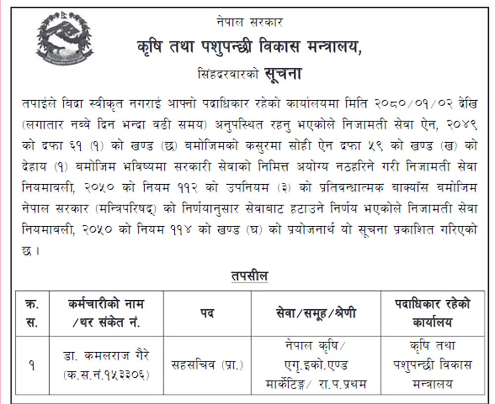 बैशाख १४ गते। कृषि तथा पशुपन्छी विकास मन्त्रालयका सहसचिव डा. कमलराज गैरेलाई सेवाबाट बर्खास्त गरिएको छ।