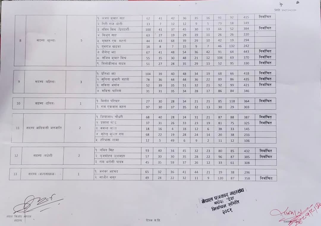 महिला उपाध्यक्षमा प्रेस चौतारी कै उम्मेदवार ज्योती झा बिजयी भएकी छिन । त्यस्तै महासचिवमा प्रेस सेन्टर, समाजवादी प्रेस संगठन, प्रेस मञ्च लगायतका संगठनका साझा उम्मेदवार शैलेन्द्र महतो (क्रान्ति) निर्वाचित निर्वाचित भएका छन । उनले ३९० मत पाएका छन् । उनको प्रतिद्वन्द्वी राजन सिंहले ३२१ मत पाएका छन् । महिला उपाध्यक्षमा ज्योती झा निर्वाचित भएकी छिन् । उनले ३७१ मत प्राप्त गरेकी छिन् ।