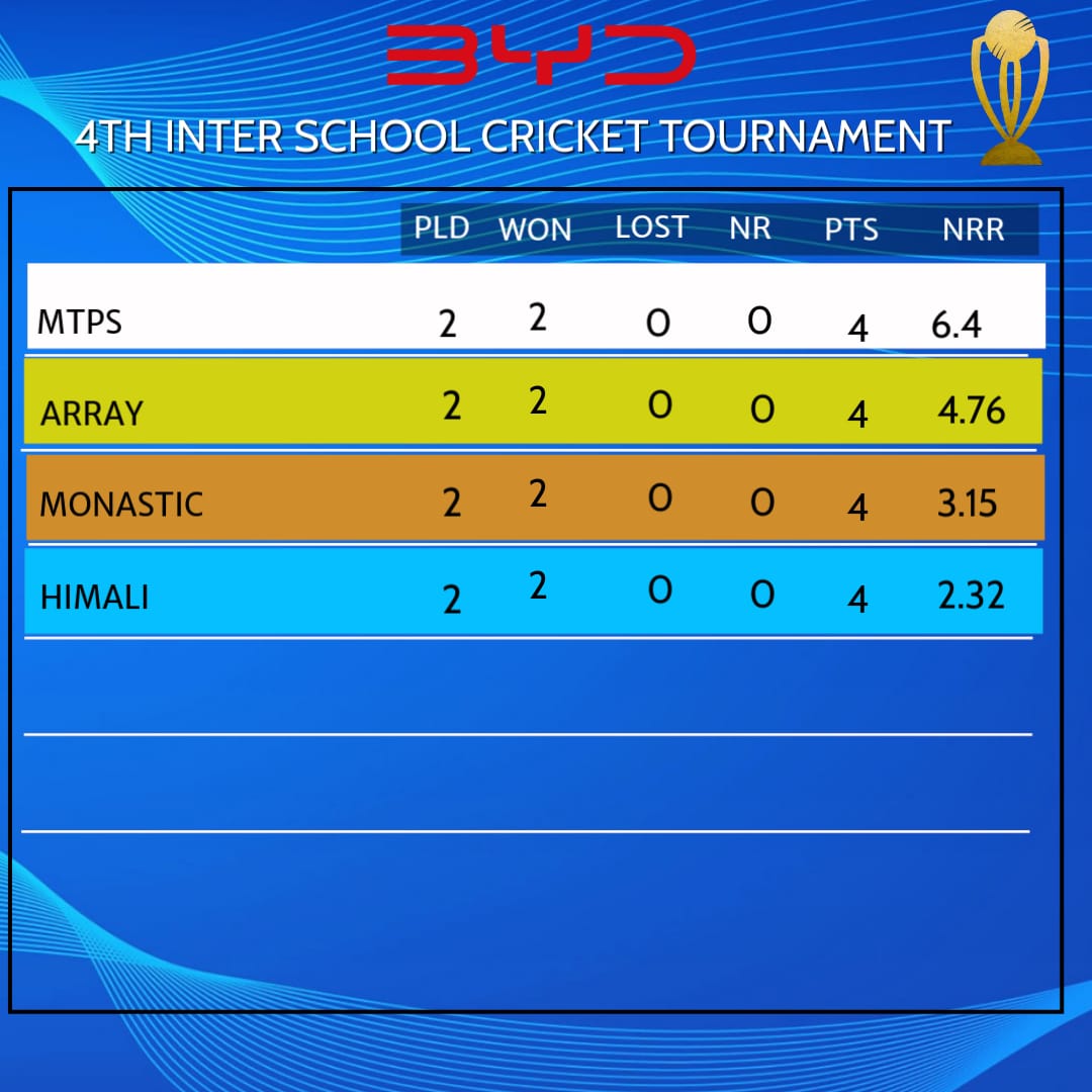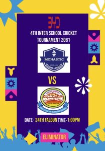 गिरिजानन्द साह/जनकपुरधाम/फागुन २३ गते। जनकपुरधाममा बिवाईडी(BYD) चौथो अन्तर स्कुल टी–२० क्रिकेट प्रतियोगिता अन्तर्गत आज मोनास्टिक स्कुल र संकटमोचन स्कुल बीच भएको खेलमा मोनास्टिक स्कुल ६७ रनले विजय भएको छ ।