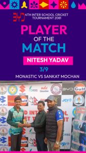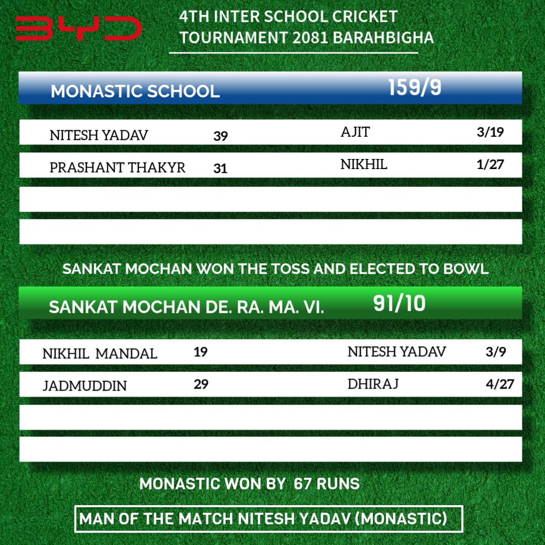 खेलमा जवाफी ब्याटिङका लागि आएका संकटमोचन स्कुलका खेलाडीहरु सबै विकेट गुमाउदै ९१ रन मात्र बनाउन सफल भयो। र उक्त खेल मोनास्टिक स्कुल ६७ रनले जित्न सफल भयो। संकटमोचन स्कुलका लागि निखिल मण्डलले सर्वाधिक १९ रन र जमुद्दीनले २९ रनको योगदान दिएको थियो । मोनास्टिक स्कुलको लागि बलिङ गरेको नितेश यादवले ३ विकेट र धिरजले ४ विकेट लिन सफल भएका थिए । यस खेलको म्यान अफ दि म्याच मदर मोनास्टिक स्कुलको नितेश यादव लाई प्रदान गरिएको थियो ।