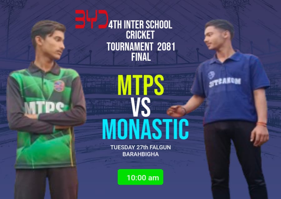 गिरिजानन्द साह/जनकपुरधाम/फागुन २६ गते। बिवाईडी (BYD) चौथो अन्तर स्कुल टी–२० क्रिकेट प्रतियोगिताको फाइनल खेल भोलि फाल्गुन २७ गते मंगलबार बिहान १० बजे हुने भएको छ। फाइनल खेल मोनास्टिक स्कुल र मदर टेरेशा स्कुलबीच बारहबिघा मैदानमा हुनेछ।