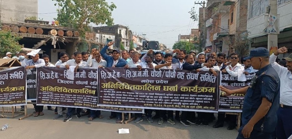 चैत २५ गते। मधेश प्रदेशको मुख्यमन्त्री तथा मन्त्रिपरिषद्को कार्यालयअगाडि स्वास्थ्यकर्मीहरूले धर्ना दिएका छन्। सोमबार ‘सिनियर अहेब तथा अनमी पाँचौं तह संघर्ष समिति’ले स्थानीय सेवा गठन तथा सञ्चालन ऐनमा त्रुटि रहेको भन्दै तीन बुँदे संशोधनको मागसहित धर्ना दिएको हो।