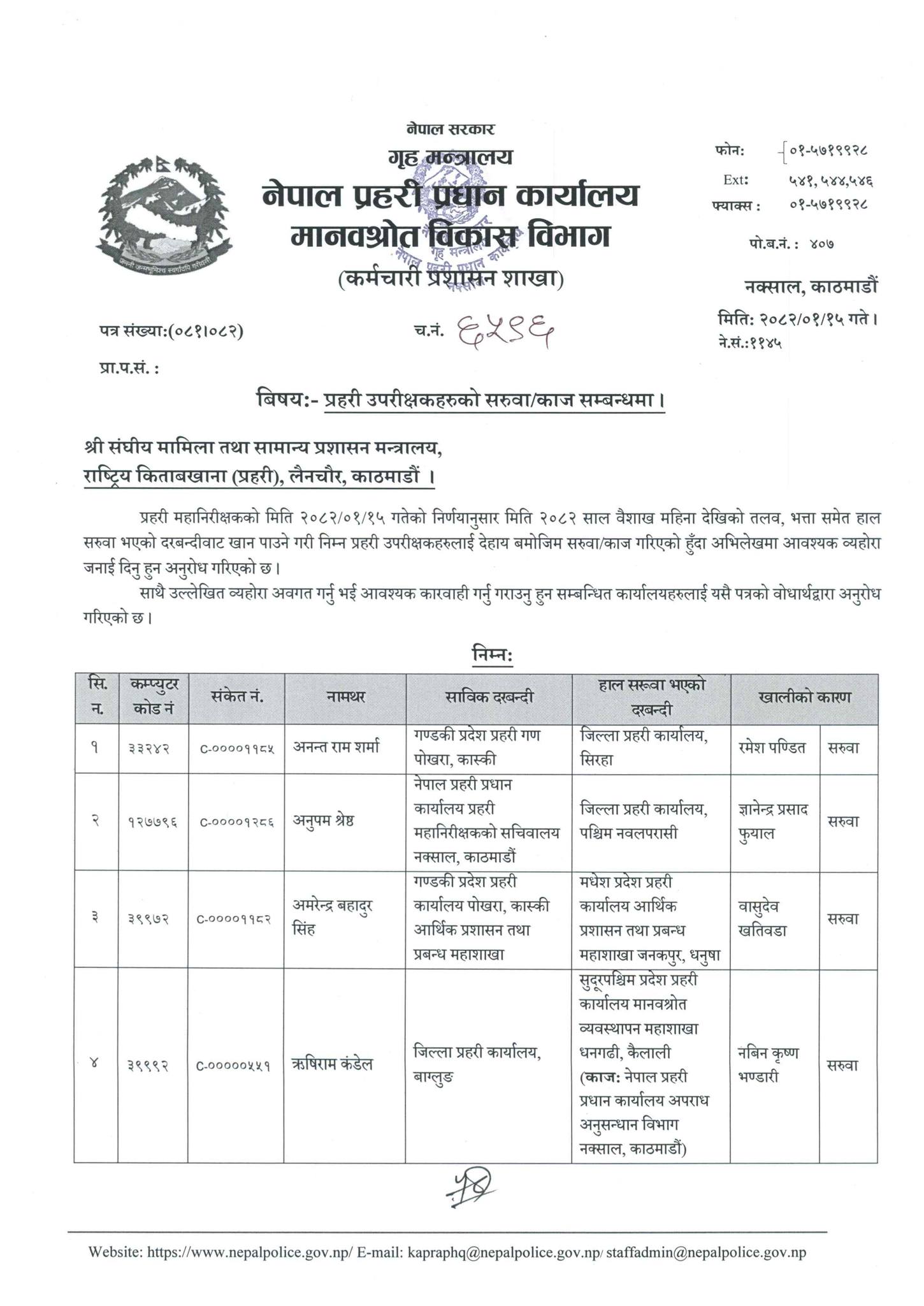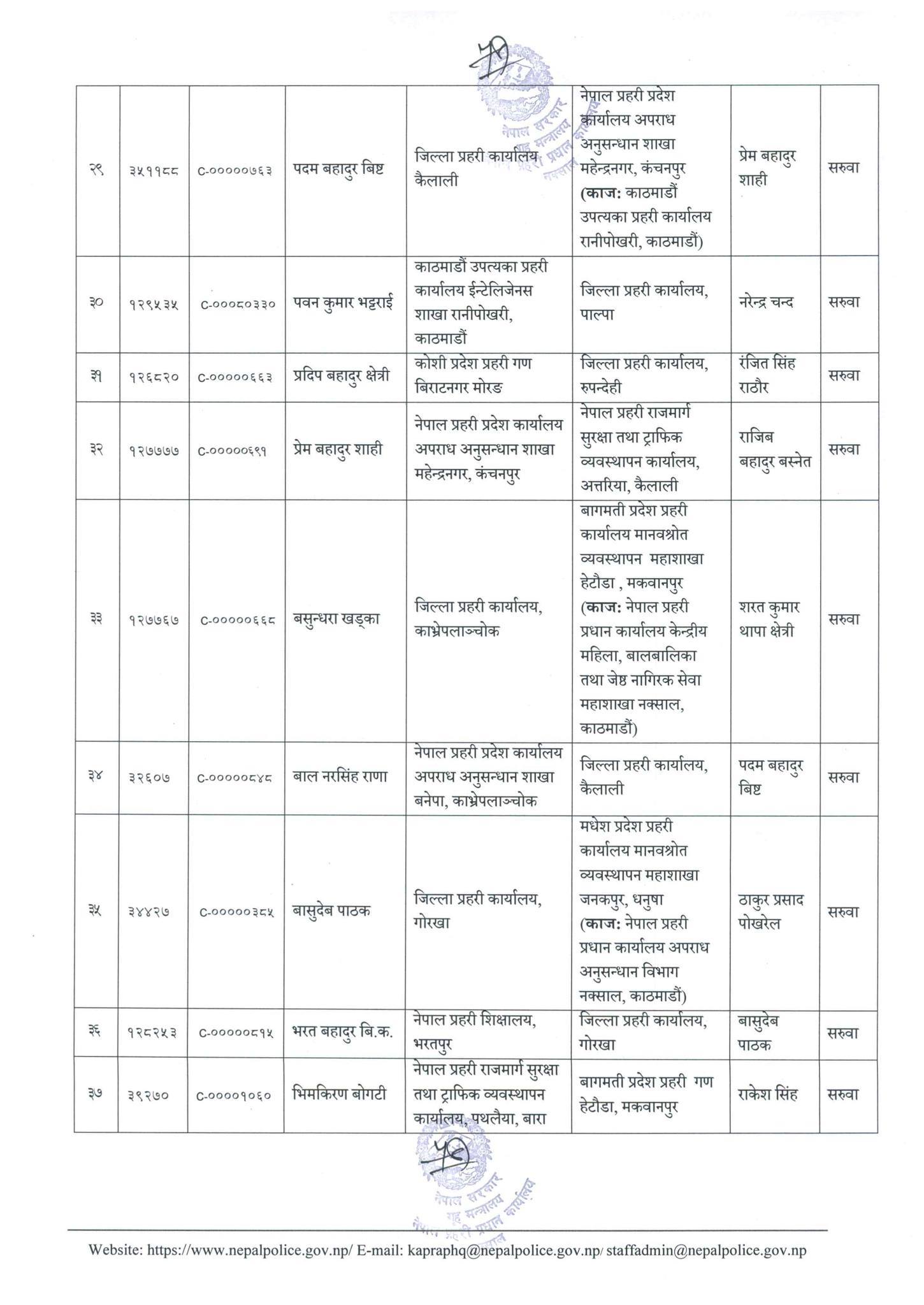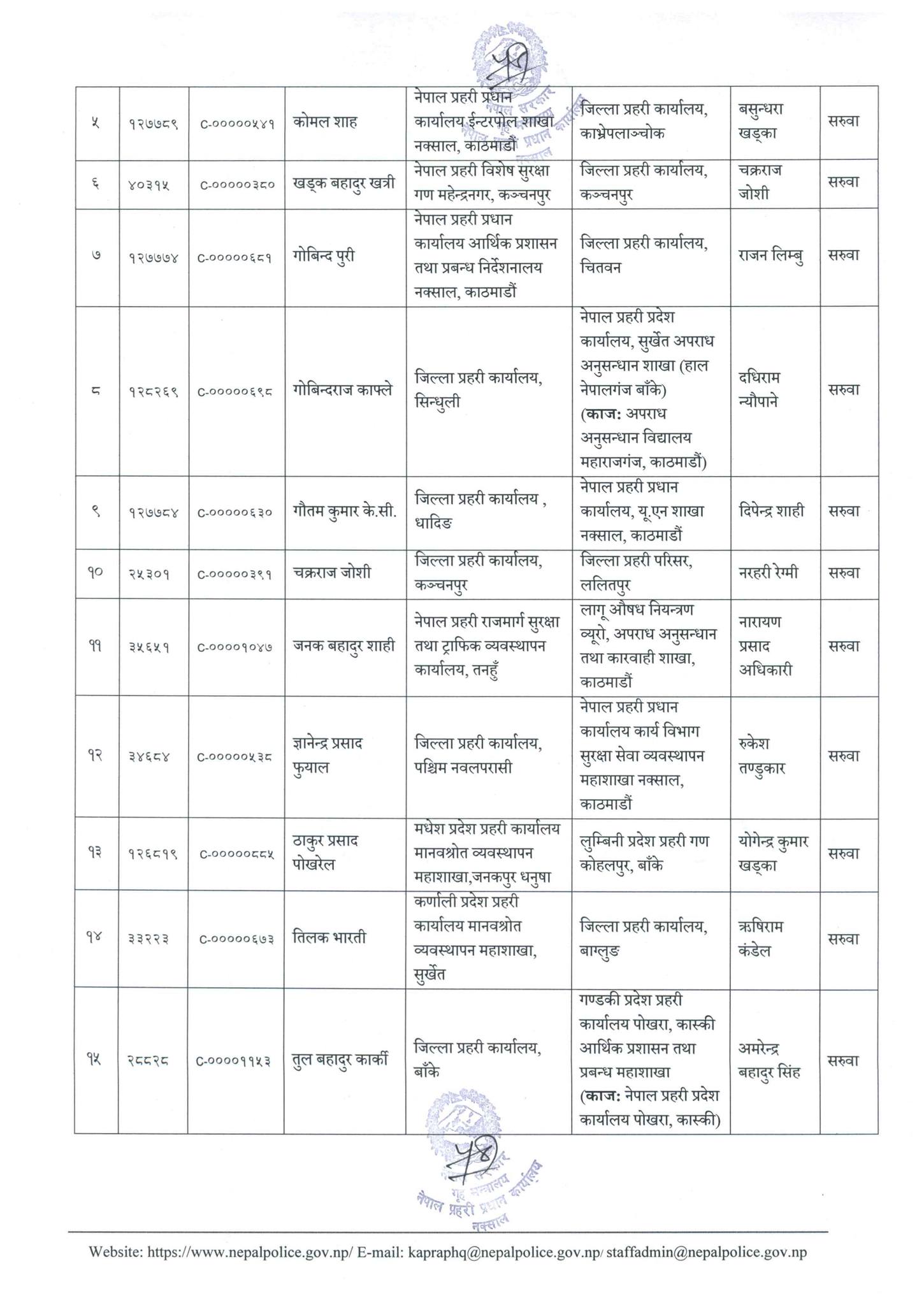 खड्क बहादुर खत्रीको जिल्ला प्रहरी कार्यालय कञ्चनपुरमा सरुवा गरिएको छ भने ठाकुर प्रसाद पोखरेलको लुम्बिनी प्रदेश प्रहरी गण कोहलपुर बाँकेमा सरुवा गरिएको छ ।