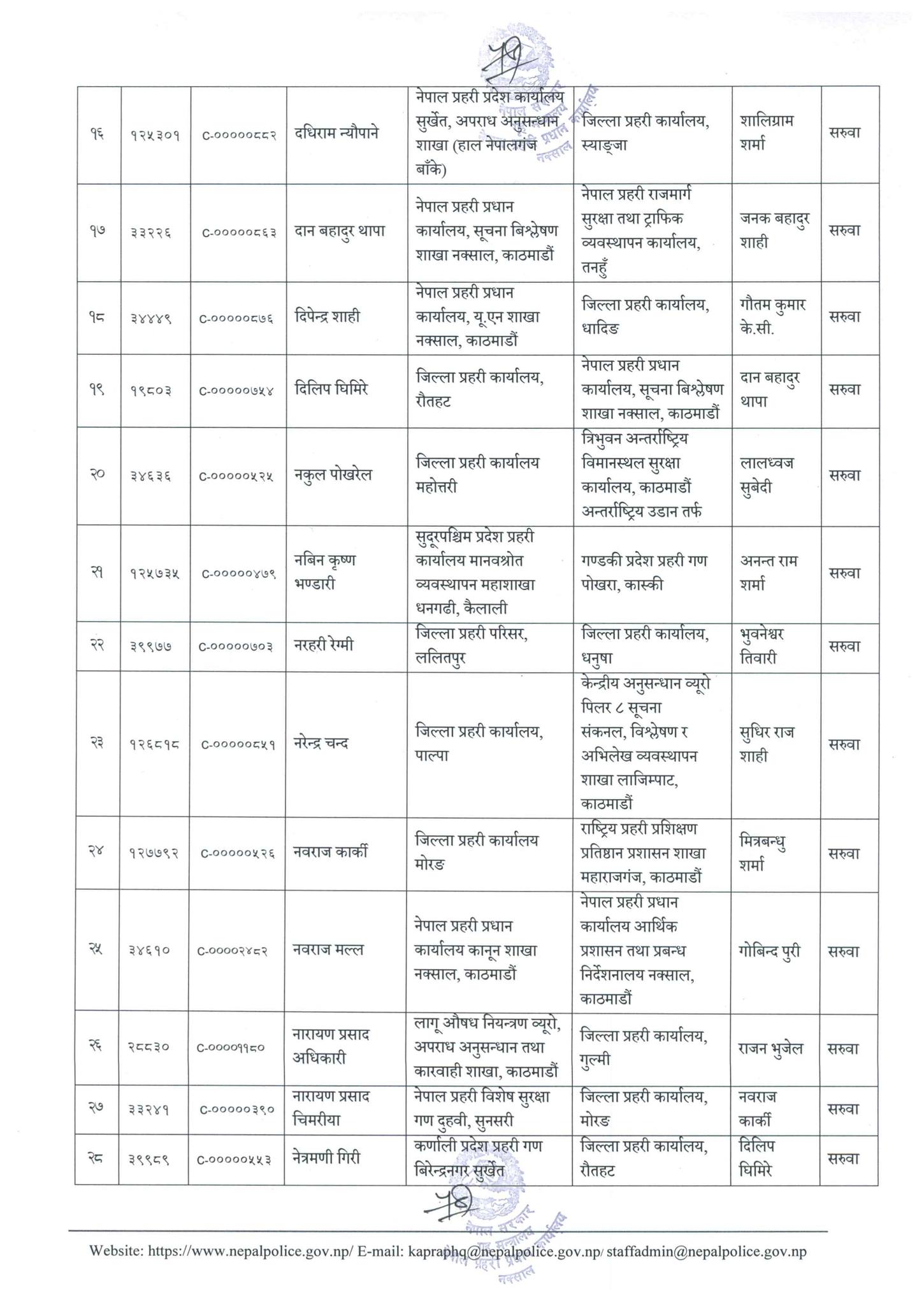 दधिराम न्यौपानेको जिल्ला प्रहरी कार्यालय स्याङ्जामा सरुवा गरिएको छ । त्यस्तै नारायण प्रसाद अधिकारीको जिल्ला प्रहरी कार्यालय गुल्मीमा सरुवा गरिएको छ ।