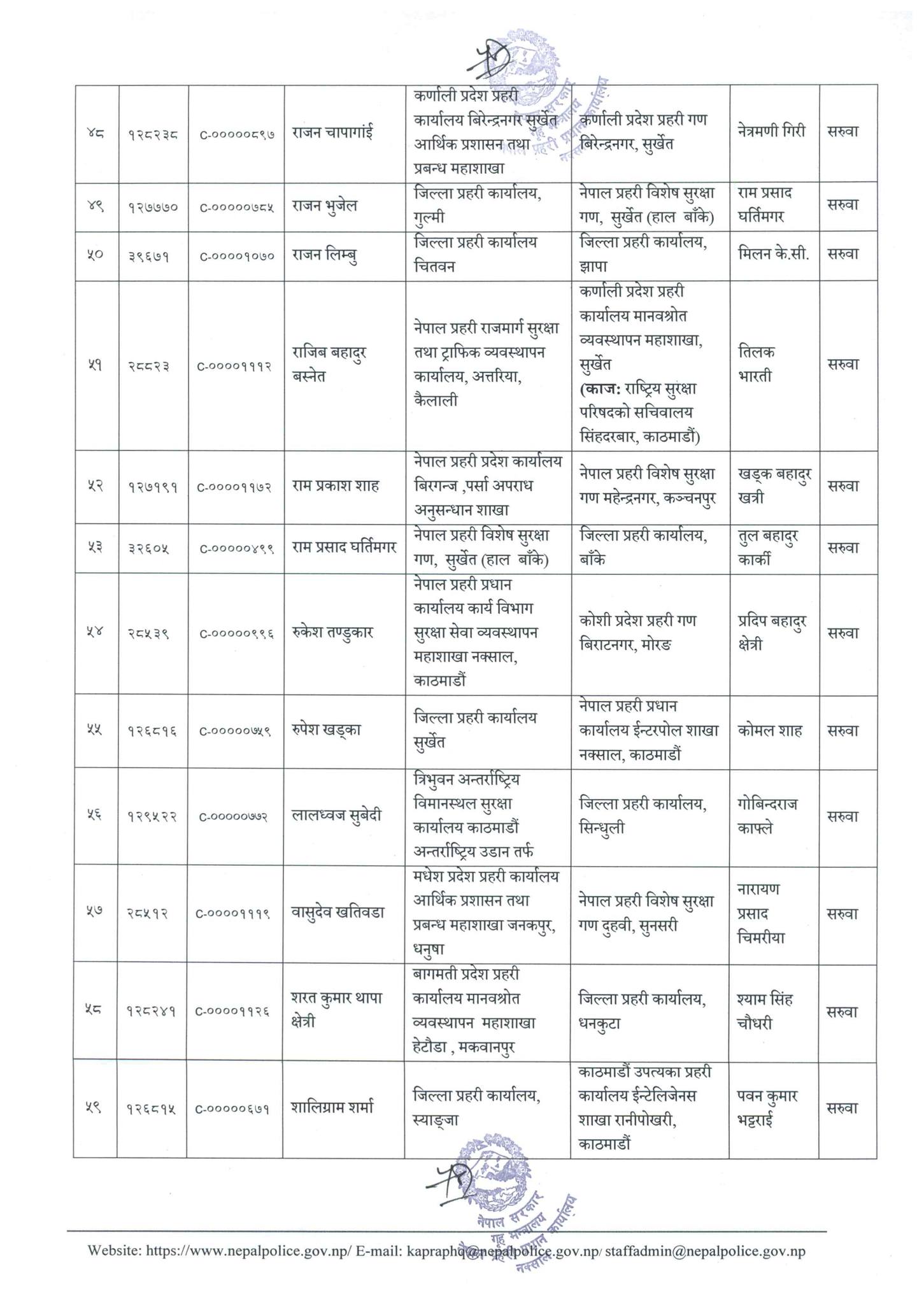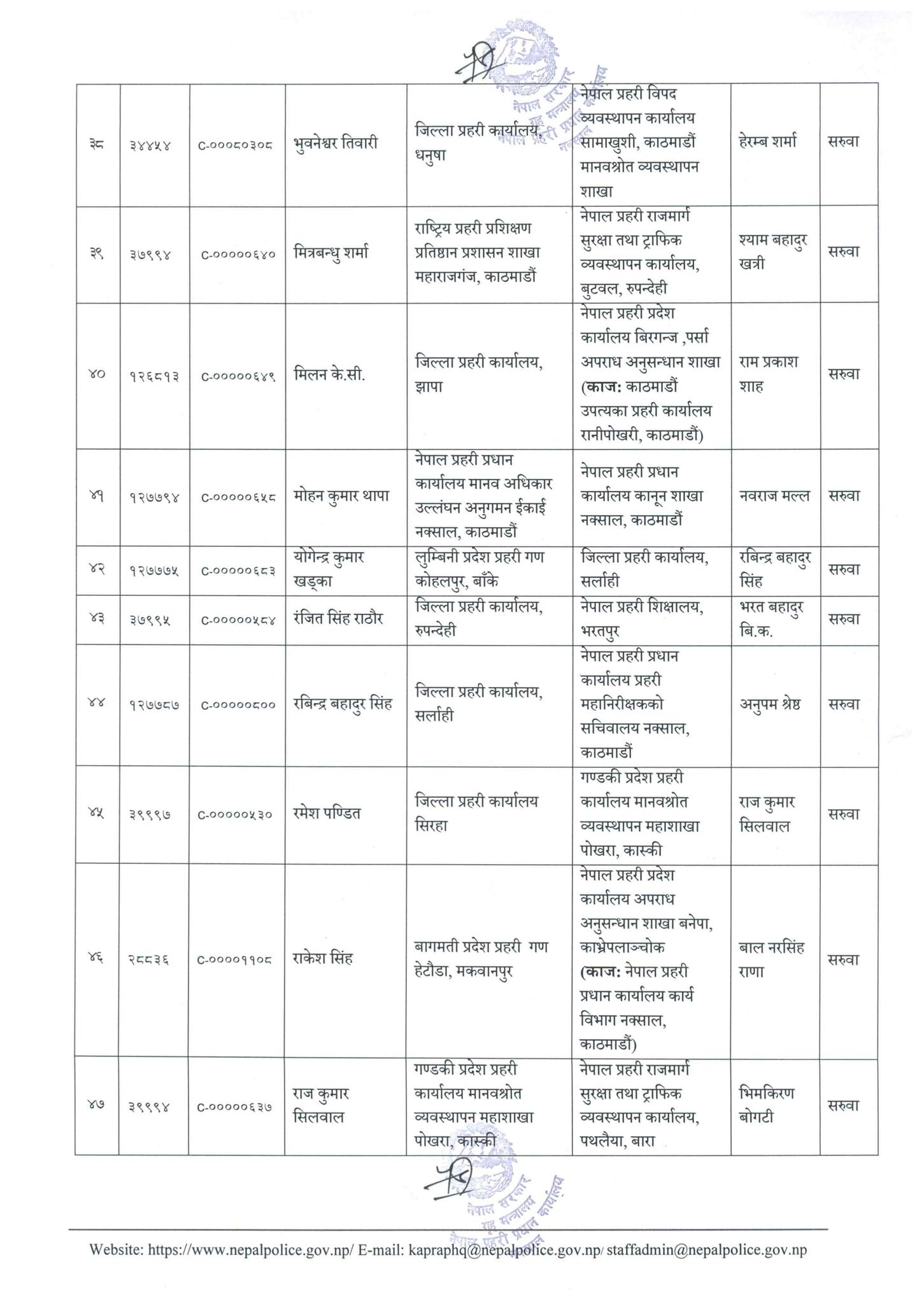 अनुपम श्रेष्ठको जिल्ला प्रहरी कार्यालय पश्चिम नवलपरासीमा सरुवा गरिएको छ । अमरेन्द्र बहादुर सिंहको मधेश प्रदेश प्रहरी कार्यालय आर्थिक प्रशासन तथा प्रबन्ध महाशाखा जनकपुर,धनुषामा सरुवा गरिएको छ ।