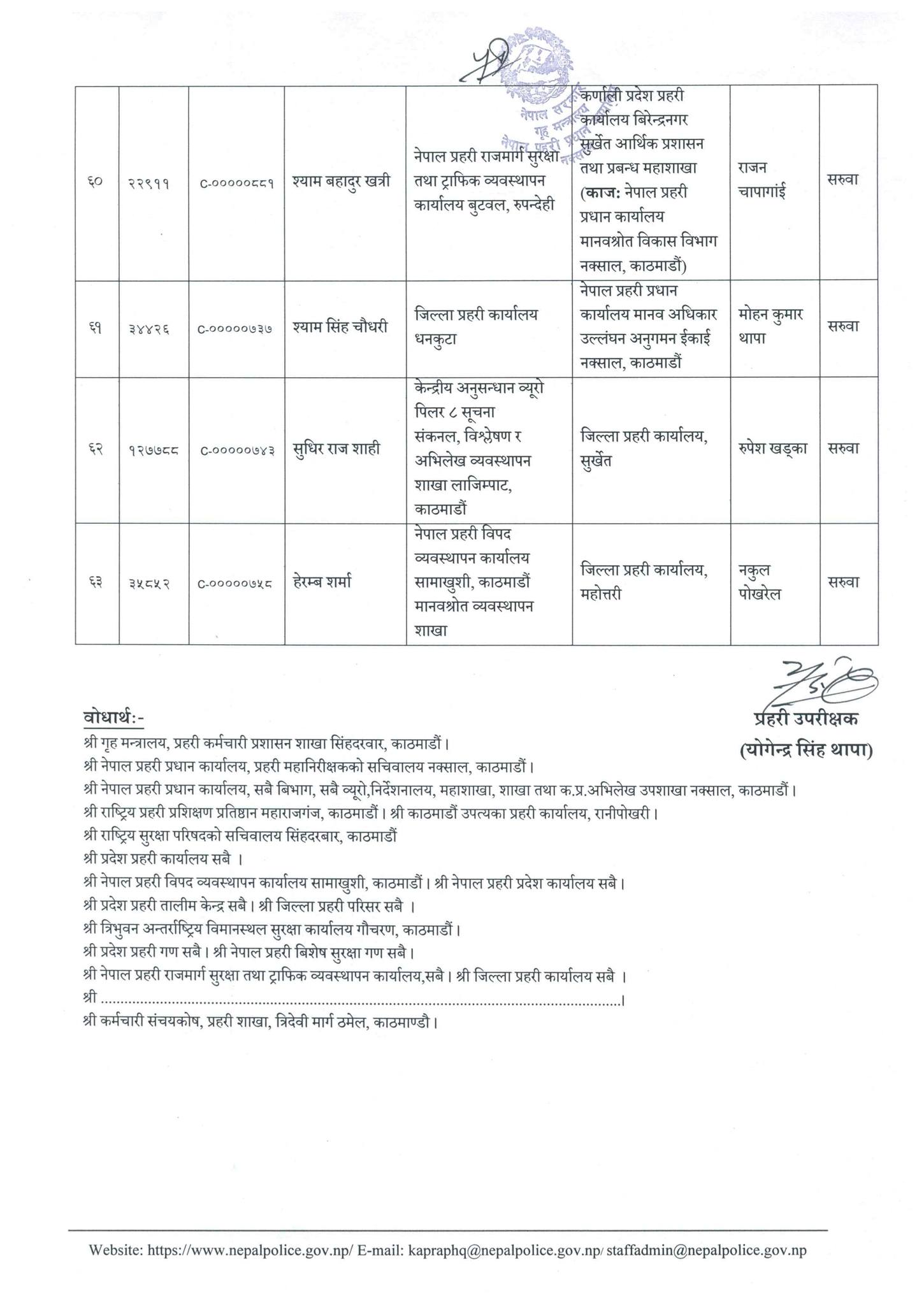 बैशाख १५ गते। ६३ जना प्रहरी उपरीक्षक (एसपी) हरुको सरुवा गरिएको छ । सोमबार उनीहरुको सरुवा गरिएको हो । धनुषाको प्रहरी प्रमुख एसपी भुवनेश्वर तिवारीलाई नेपाल प्रहरी विपद ब्यबस्थापन कार्यालय सामाखुशी काठमाण्डौ मानवस्रोत ब्यबस्थापन शाखामा सरुवा गरिएको छ भने धनुषाको प्रहरी प्रमुख एसपीमा नरहरि रेग्मीलाई सरुवा गरीएको छ। त्यस्तै अनन्तराम शर्माको जिल्ला प्रहरी कार्यालय सर्लाहीमा सरुवा गरिएको छ ।